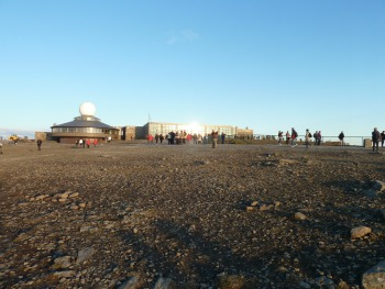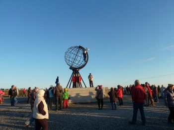 This is the weather at the Nordkapp. 71 degrees North. The furthest North that you can drive in Europe. In summer you can join the thousands of other people who come here to photograph the midnight sun. There is a modern visitor centre with a cafe, a picture house showing a film about the area, a souvenir shop whose prices are remarkably reasonable compared with other places. and a viewing area. Outside there is a globe monument and big wheelstones depicting each continent. At midnight on a clear Summer evening the atmosphere is magical. Nothing happens, the sun looks the same at 11p.m. or 1 a.m. but you are on a large plateau 300M. above the sea at what is "the end of the world". You have done it and.like many others, you have a sense of achievement.