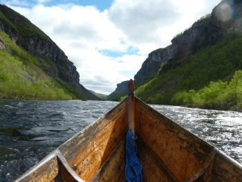 The peaceful little port of Honningsvag at 71 degrees north is the jumping off point for the Nordkapp. Up here it does not get dark for weeks during the summer. There is an ice bar in town and a couple of hotels, plus adventures at 71 degrees north company.. The North Cape is about 25 Km further north and that is the end of the road. Honningsvag has only 2,500 people but has its own airport. | Heading up through the rapids into the Alta river canyon, the largest in Northern Europe and a great 20Km trip. Ask at the Alta tourist office about where to join the guide. The special boats only take up to about 8 people. You can often go on the spur of the moment without the need to book. The trip is not expensive and nothing like as commercial as the Grand Canyon. Like everything in Norway it is very natural , laid back and more enjoyable without the tourist hordes. |