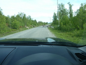 The visitor centre at the Nordkapp with people waiting for midnight to photograph the midnight sun. This is 71 degrees north. You are well inside the Arctic Circle here but the summer temperatures are fine. Usually 10-20C | Reindeer near Alta in Northern Norway. You will see them all over the place and have to take care not to drive into them. Which one is Rudolph? They are actually smaller than we thought they would be. |