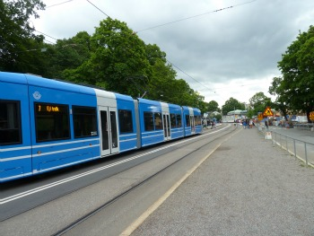 ![]() View over Brunnsviken in Stockholm's Haga Royal Park taken the garden of the Stallmastaregarden hotel about 4 km,. North of Stockholm city centre. This was the very first inn to be built in Sweden. We stayed here in the Summer of 2012. It is not easy to find by car since it is near where they are constructing a new major road. The hotel itself is nice and quiet and in a superb location. Stockholm centre is about 10 minutes by bus. The bus from town stops outside the hotel but to get to town you must walk over the pedestrian flyover.. | ![]() Modern trams operate in parts of the delightful city of Stockholm. The city is built on 14 islands connected by 57 bridges. It is clean and a delight to explore. Take one of the boat excursions from the city centre to get a good overview. You can also hire a bike and use the extensive network of cycleways to explore the city. There is a holiday island oasis of greenery just over a bridge from the city centre. |