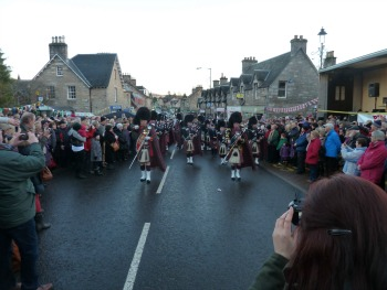 Atholl Highlanders Pipe Band in Pitlochry at Hogmanay 2013. The main street of the village is closed for ceilidh dancing each Hogmanay. Pitlochry has a salmon leap and a fine theatre. It is located just off the A9 about an hour north of Edinburgh. |