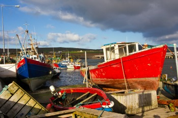 Clew Bay in Country Mayo Ireland. In this bay is the famous Clare Island former home of Grainne O'Malley the pirate Queen. From the shores of Clew Bay rises the holy mountain, Crough Patrick better known as The Reek. On the last Sunday in July many pilgrims, some barefoot, climb 762M. (2507') to the church at its summit. | Port Magee is a lovely little fishing village in County Kerry. All along the Irish coast are little places like this. |